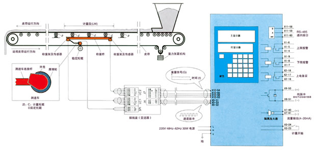 上述兩個被測量的物理量(重量和速度)被同時傳到稱重積算儀中, 電子皮帶秤重量和速度兩個物理量在稱重積算儀中被立即(約0.0001秒)計算成為法定重量單位(公斤 -kg,噸 -t,磅 -lb),并按用戶的設(shè)定顯示出瞬時流量和累計量。同時送出各遠傳信號。